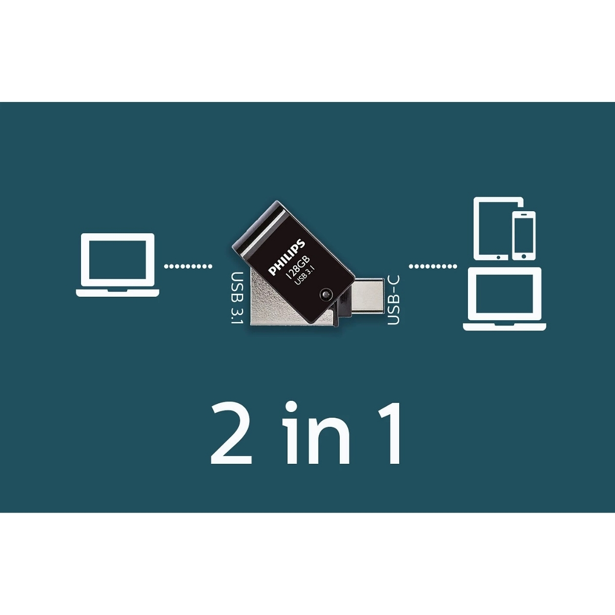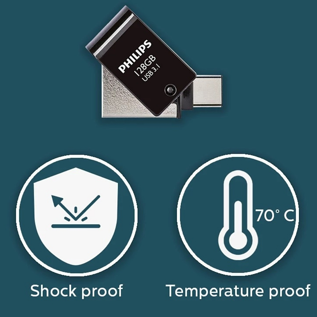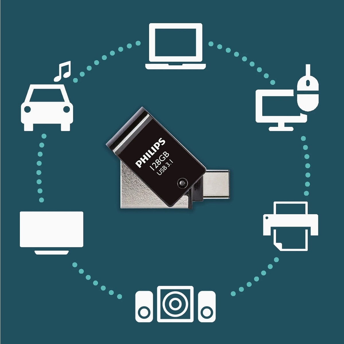 Bu USB bellek, hem USB 3.1 (USB-A) hem de Type-C konnektörleri sayesinde bilgisayarlar, akıllı telefonlar ve tabletlerle uyumlu olarak çalışır. USB-A girişi bilgisayarlardaki veri aktarımı ve depolama için kullanılırken, Type-C girişi sayesinde modern telefon ve tabletlerle doğrudan veri paylaşımı mümkündür. Her iki cihaz türü arasında kolay ve hızlı veri aktarımı için ideal bir çözümdür.