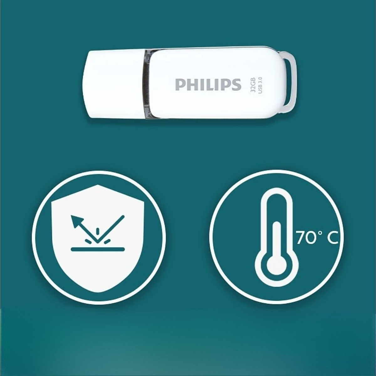 Philips Snow USB 3.0 bellek, 100 MB/s’ye kadar okuma hızıyla dosyalarınızı bilgisayarınıza çok daha hızlı aktarır. Fotoğraflar, müzikler ve belgeler gibi günlük dosya ihtiyaçlarınız için idealdir. USB 2.0’a göre çok daha kısa sürede veri aktarımı sağlar.