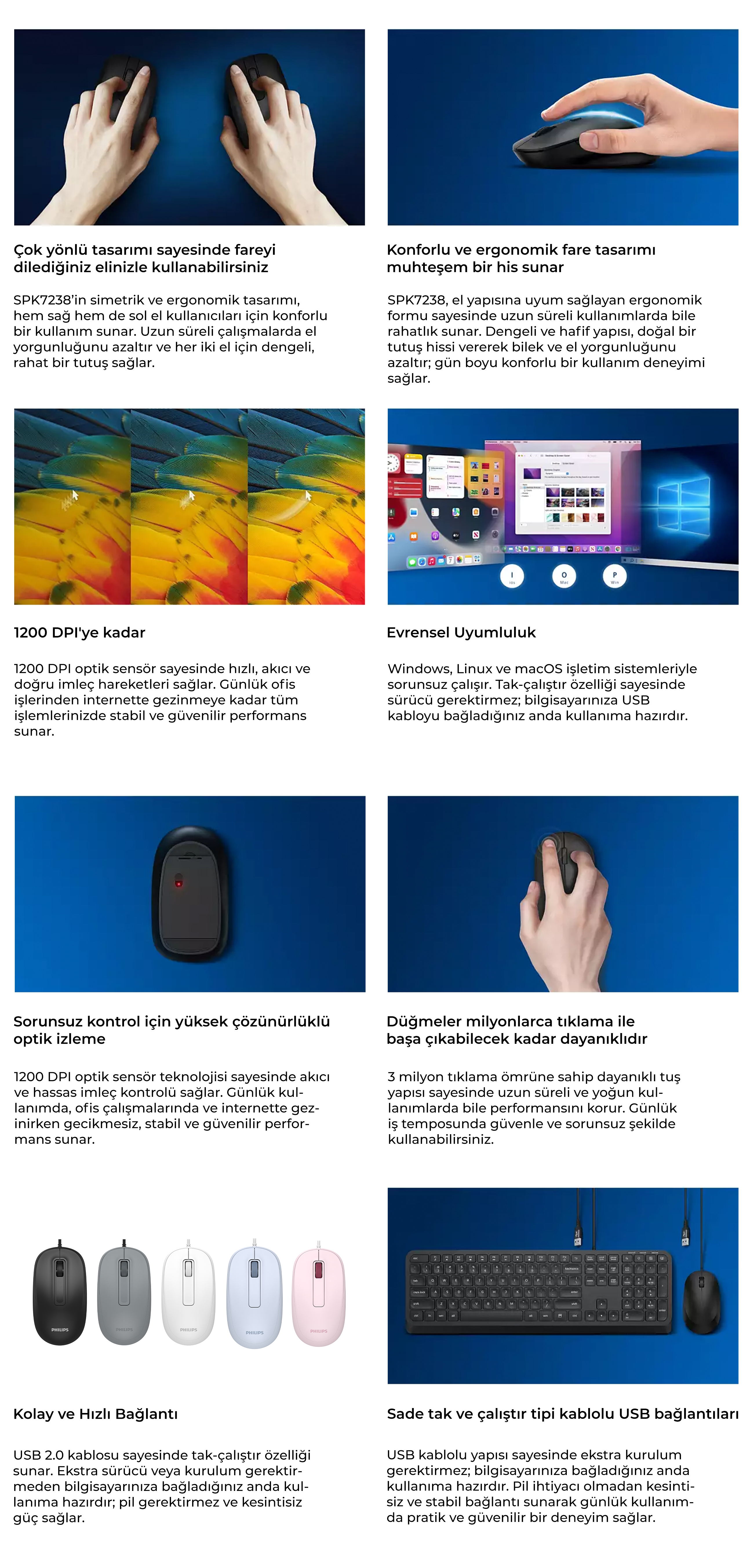 Philips SPK7238, 1200 DPI hassasiyetli optik sensörü sayesinde her hareketinizi tam kontrol altında tutar; ergonomik tasarımı ile uzun süreli kullanımlarda konfor sunarken, 3 milyon tıklama ömrüne sahip dayanıklı tuşları ile güvenilir performans sağlar. USB kablolu tak-çalıştır özelliği, kompakt ve hafif yapısı ile hem masanızda hem de hareket halindeyken kullanım kolaylığı sunar.