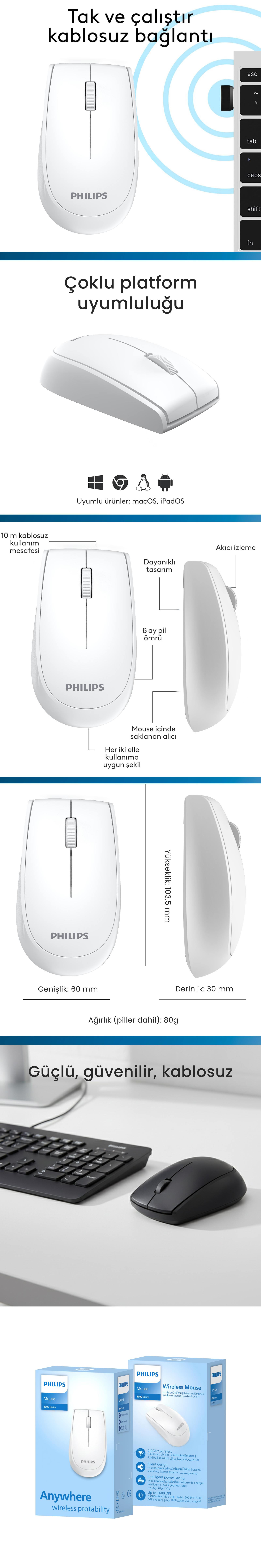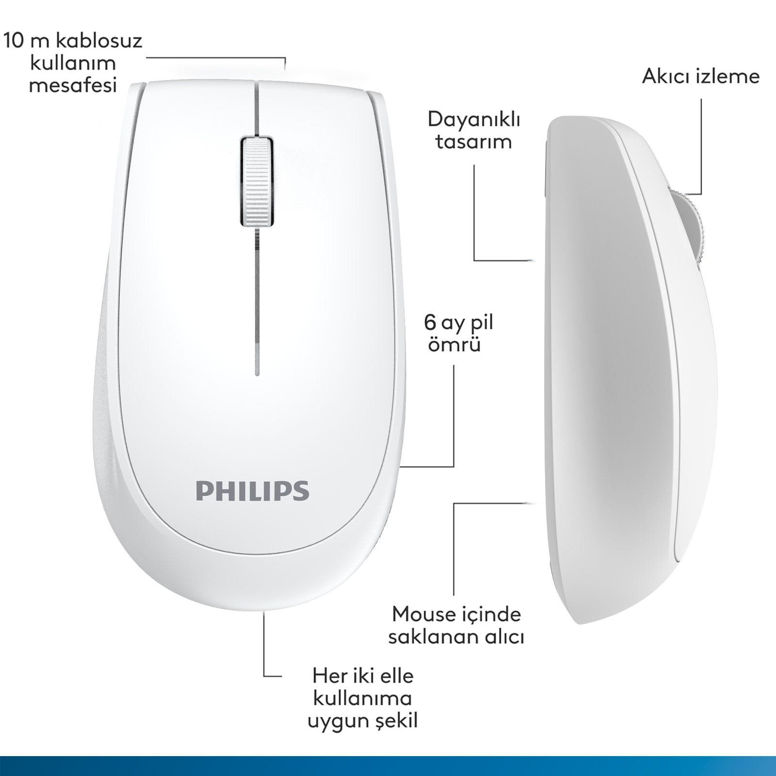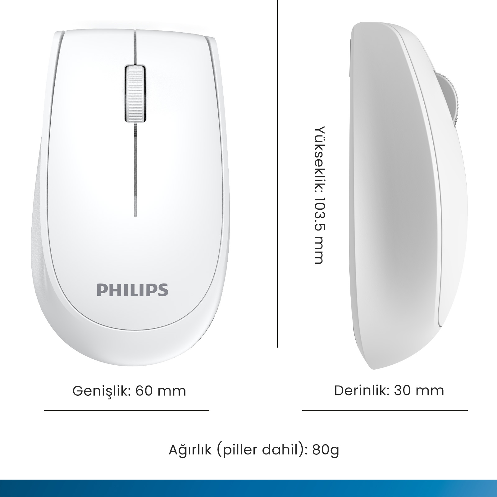 Philips SPK7317 kablosuz mouse, kullanım kılavuzu ve 1x AA pil. Kutusundan çıkarır çıkarmaz kullanıma hazırdır.