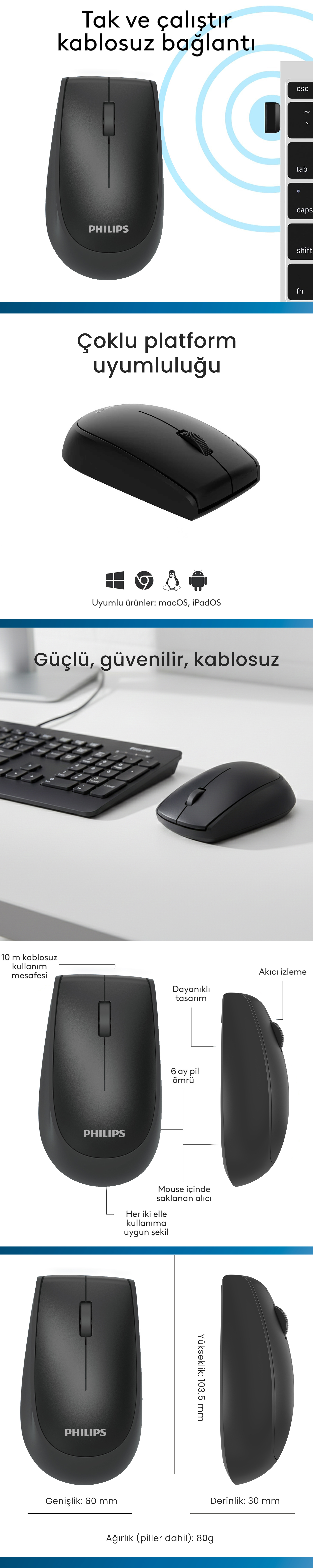 Philips SPK7317, 1600 DPI hassasiyetli optik sensörü, dayanıklı ve ergonomik tuşları ile konforlu kullanım sunarken, 2.4GHz kablosuz bağlantısı ve kompakt tasarımı sayesinde ofiste veya hareket halindeyken özgür ve sorunsuz bir deneyim sağlar.