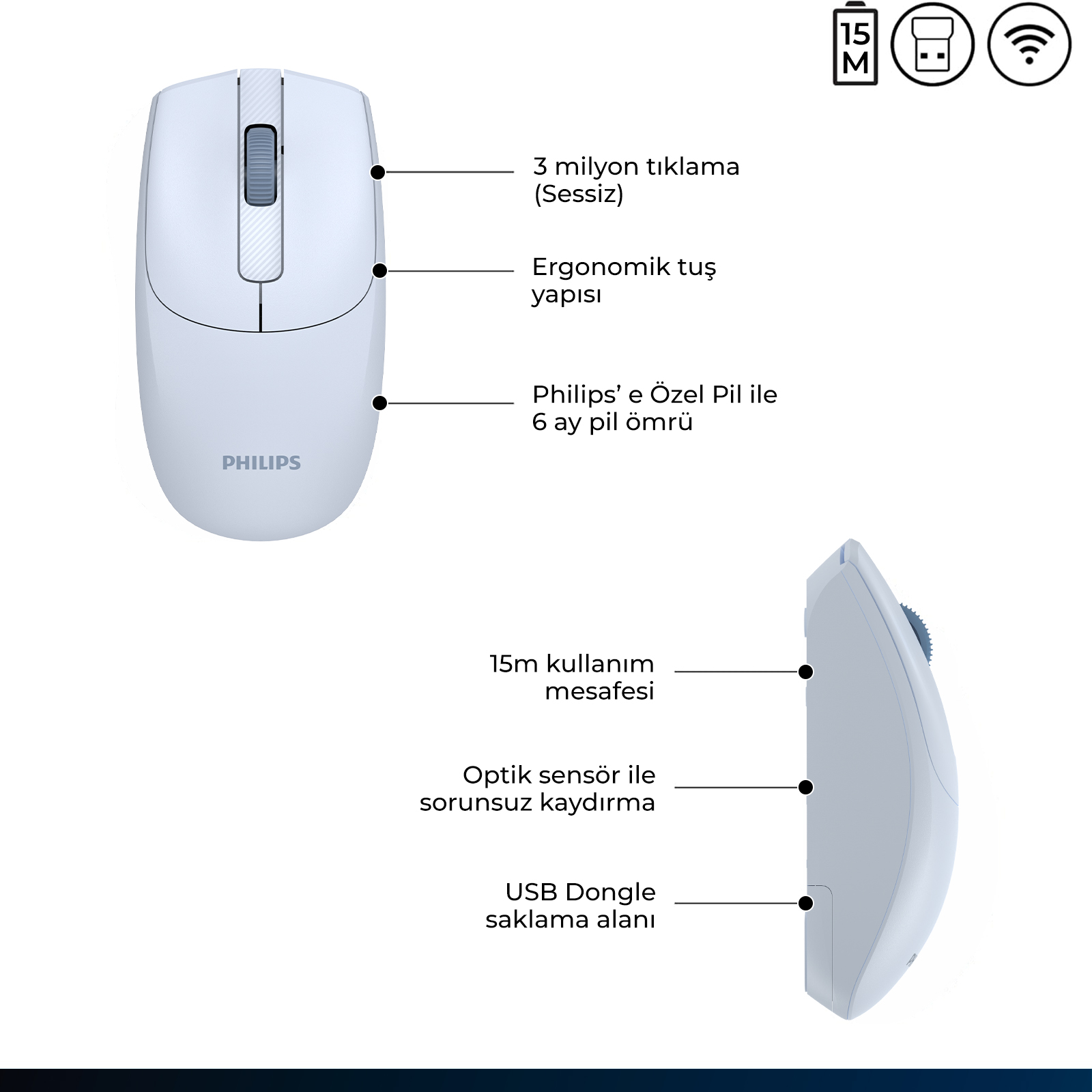 Philips SPK7398, 1600 DPI hassasiyetli optik sensörü ve 15 metreye kadar çekim mesafesi sunan 2.4GHz kablosuz bağlantısı ile özgür hareket imkânı sağlar. Sessiz ve dayanıklı tuşlarıyla konforlu, ergonomik tasarımıyla da uzun süreli kullanımlarda rahat bir deneyim sunar. Philips’e özel uzun ömürlü piliyle enerji verimliliği ve güvenilir performansı bir arada yaşatır.