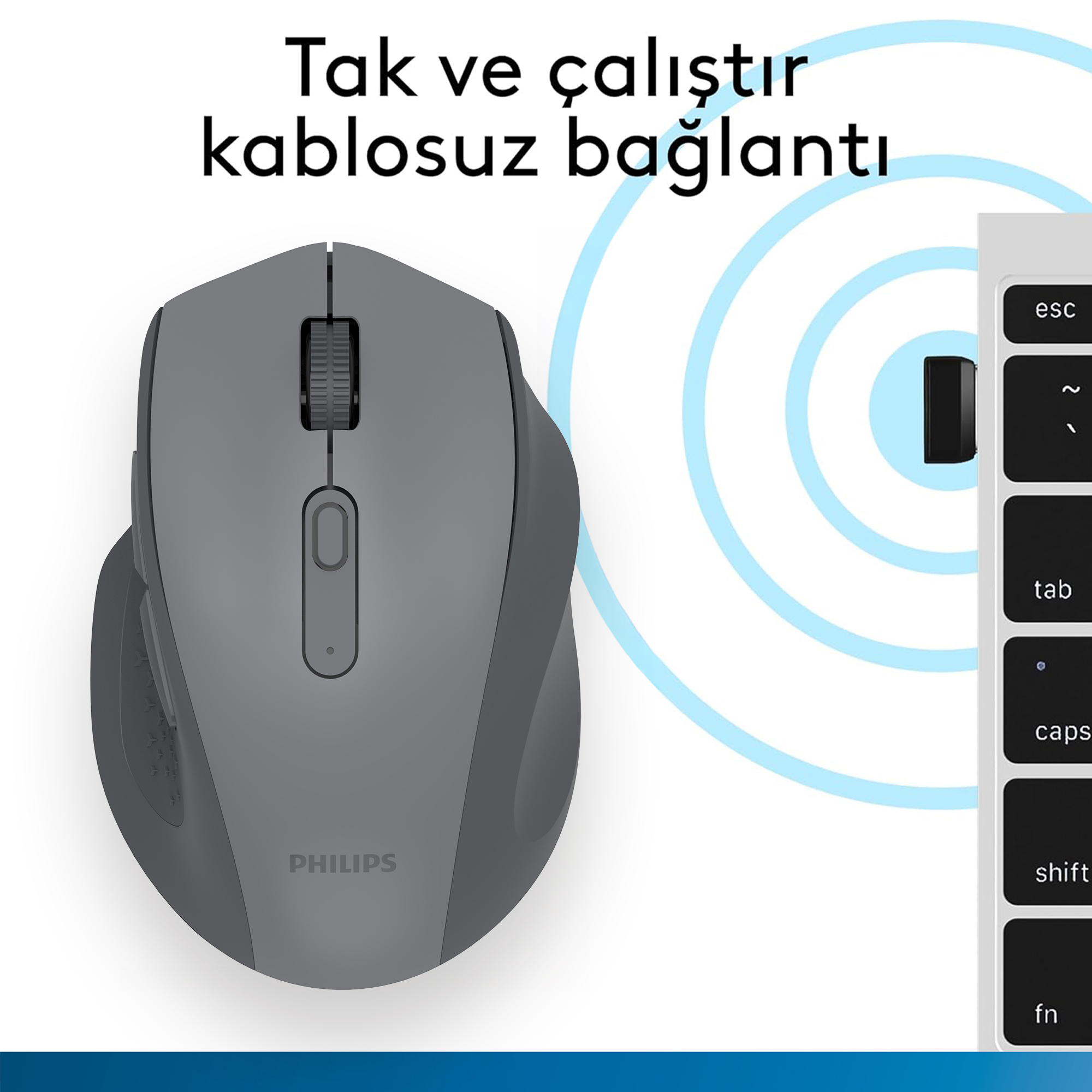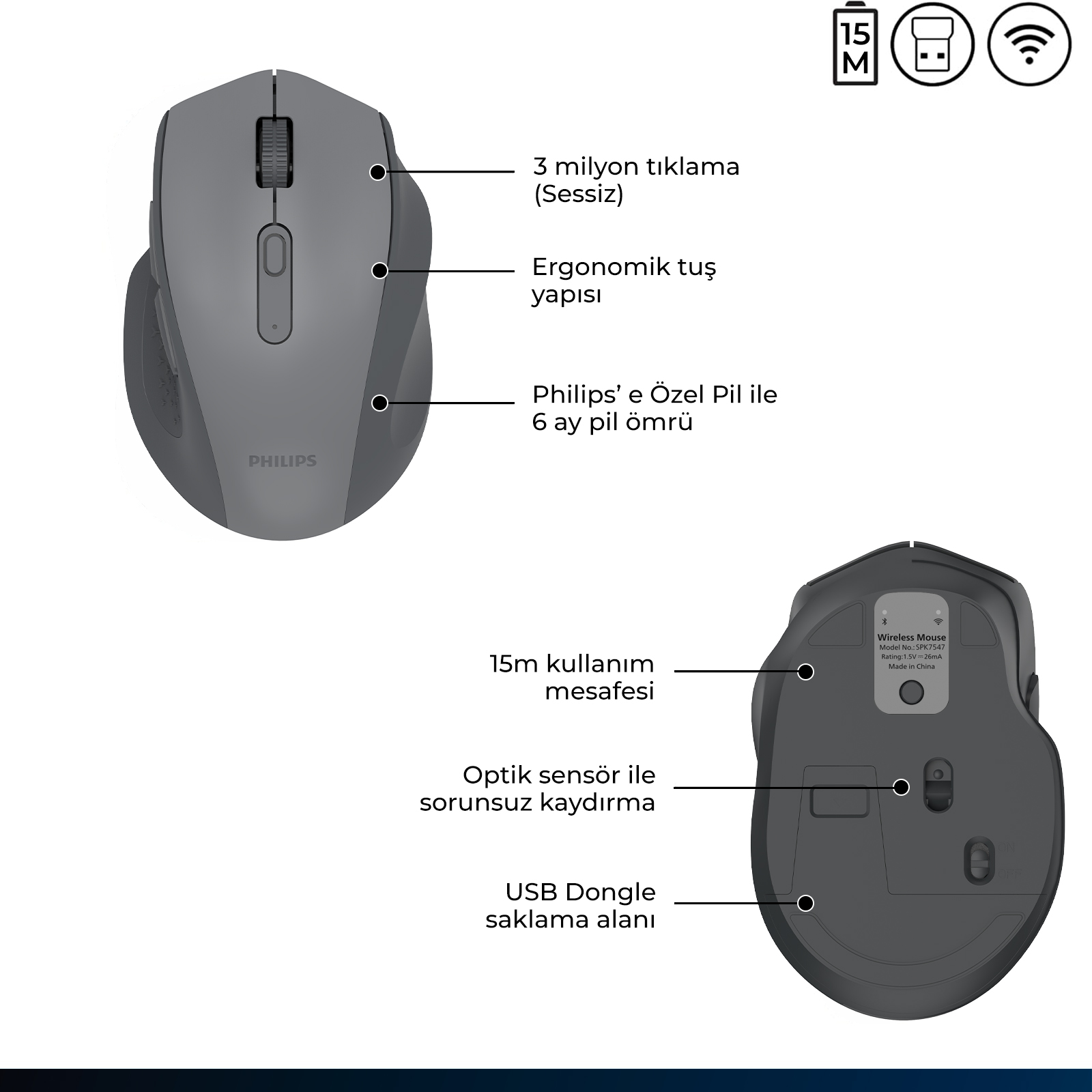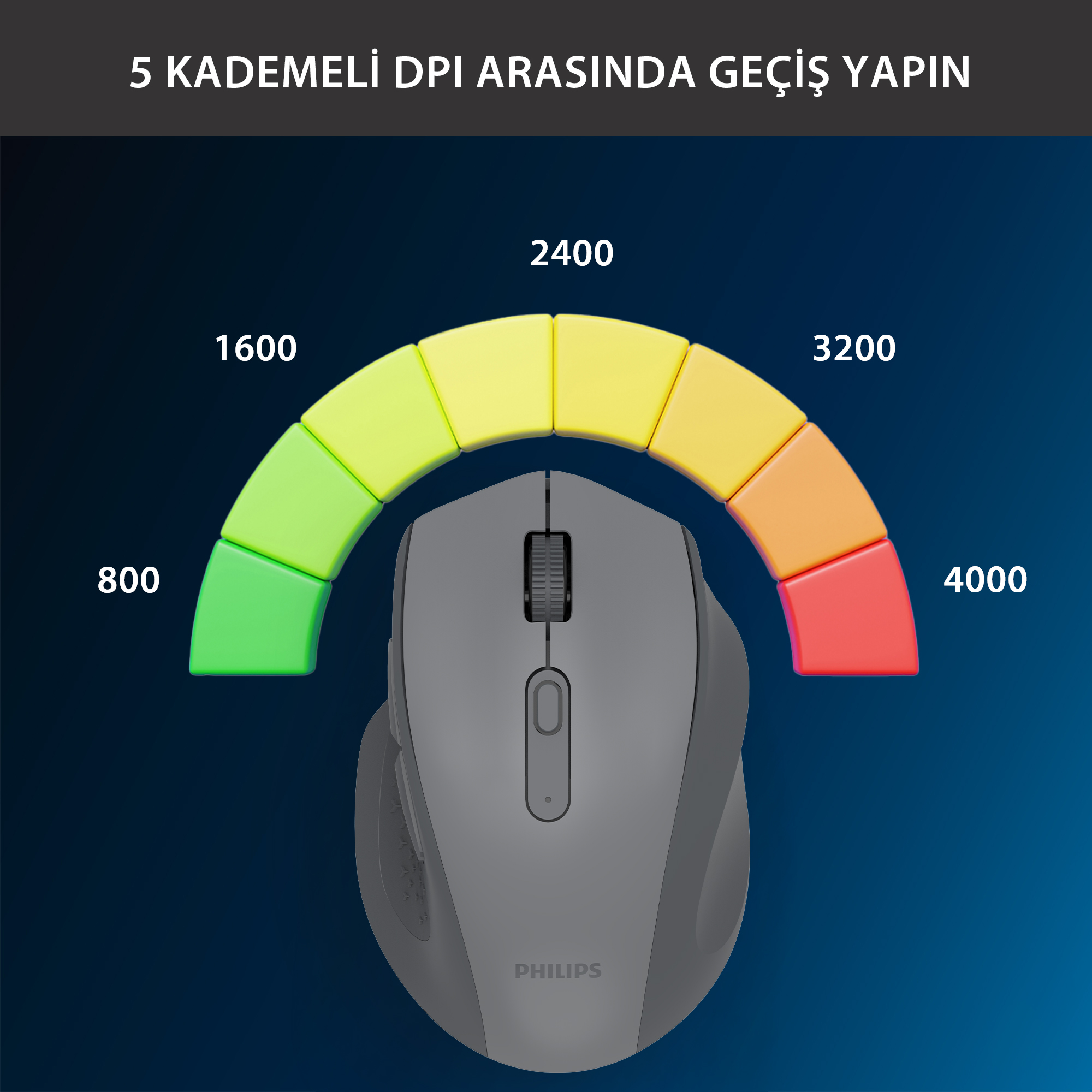 Philips SPK7547 Kablosuz Bluetooth 4000DPI 7 Tuşlu Optik Sessiz Mouse Gri