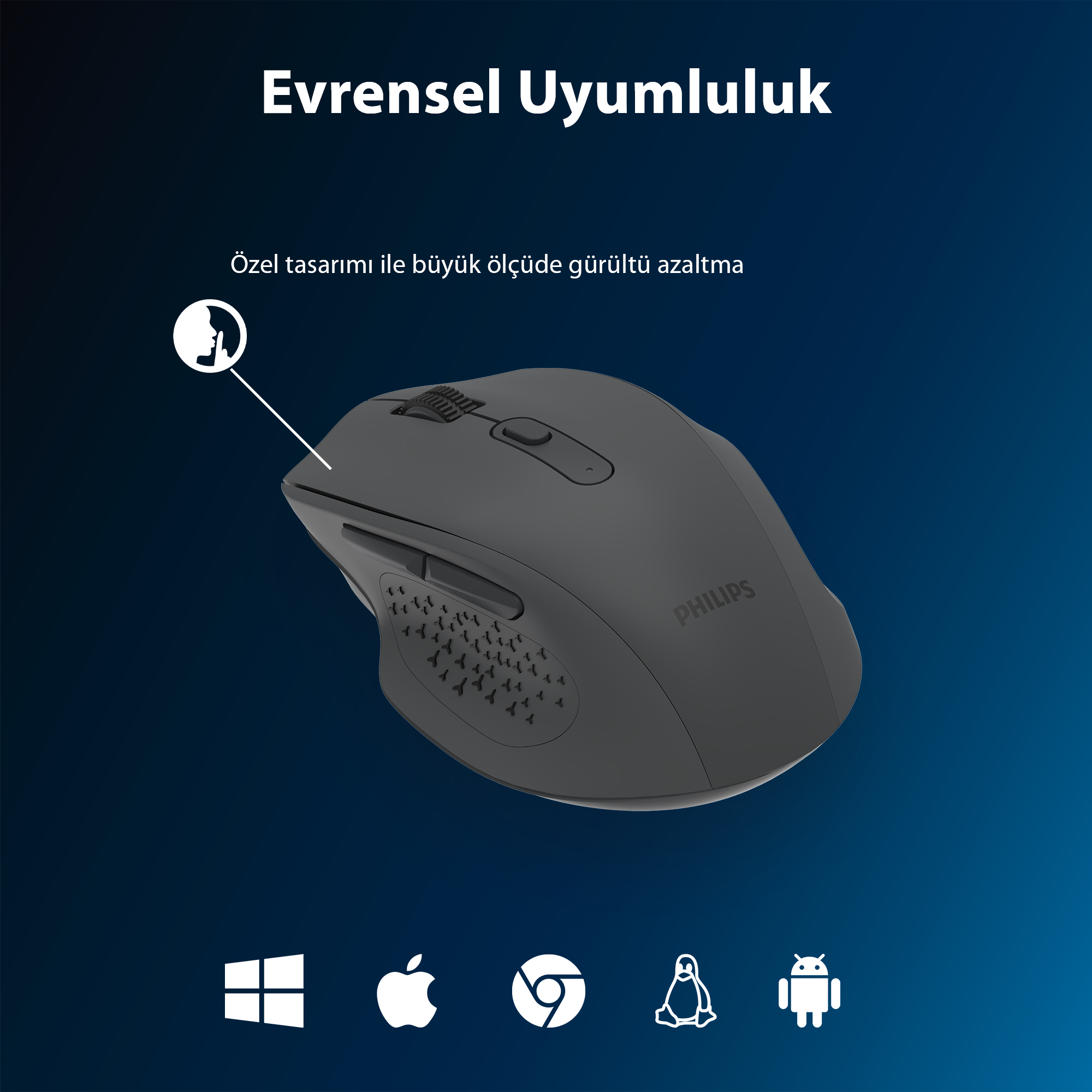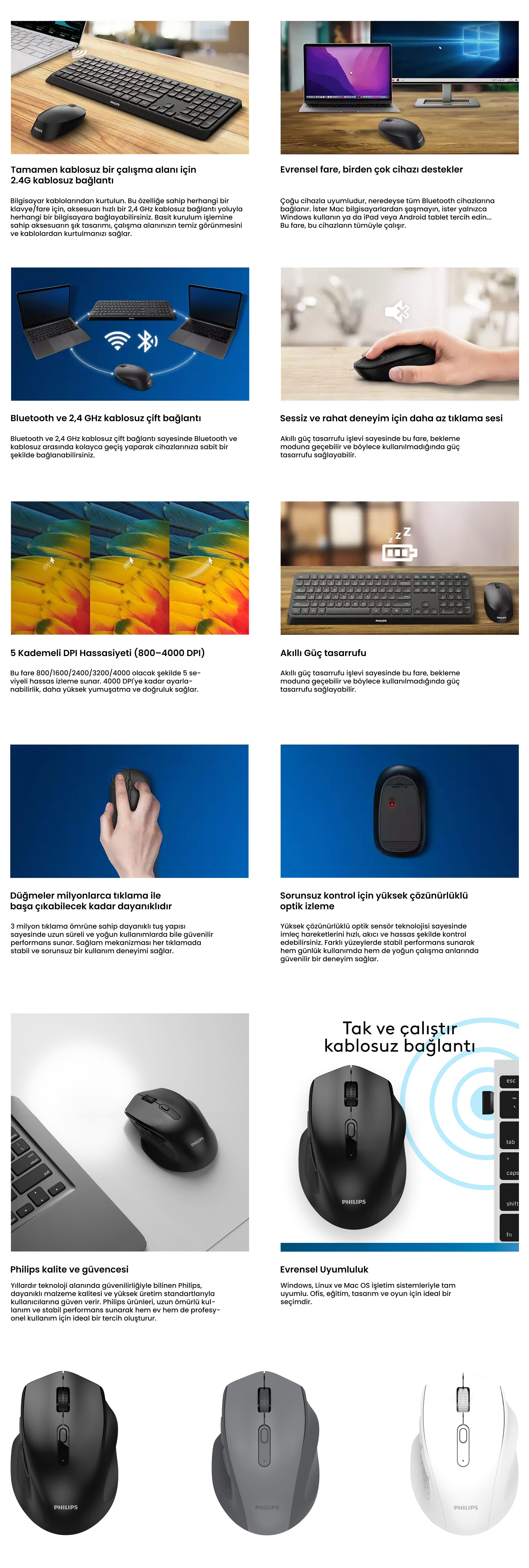 Philips SPK7547, 2.4GHz ve Bluetooth 3.0/5.2 çift modlu üç kanallı bağlantısı sayesinde aynı anda üç farklı cihaza bağlanabilir ve tek tuşla geçiş yapma kolaylığı sunar. 800–4000 DPI arası ayarlanabilir hassasiyeti, 7 fonksiyonel tuşu ve ergonomik tasarımıyla hem profesyonel işler hem de oyunlar için üstün performans sağlar. Philips’e özel uzun ömürlü piliyle verimli, kablosuz ve kesintisiz bir kullanım deneyimi sunar.