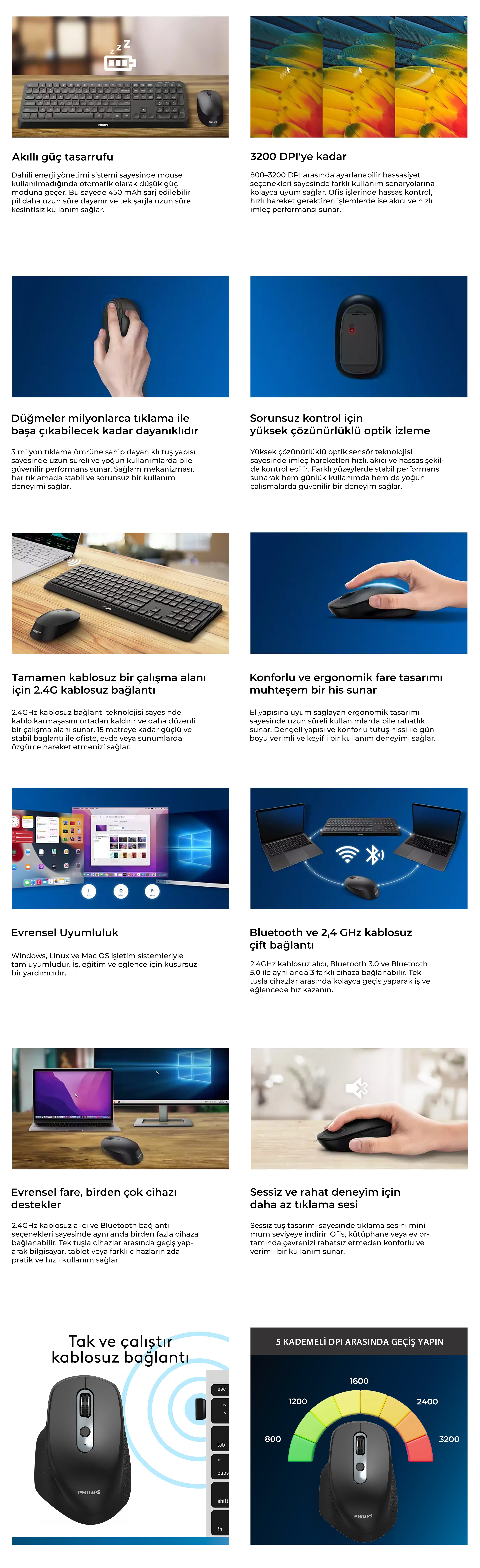 Philips SPK7818, 3200 DPI hassasiyetli optik sensörü, 8 sessiz tuşu, ergonomik tasarımı ve 2.4GHz/Bluetooth çoklu bağlantı seçenekleri ile ofis, eğitim ve eğlence kullanımında uzun ömürlü, konforlu ve kesintisiz bir kablosuz deneyim sunar.