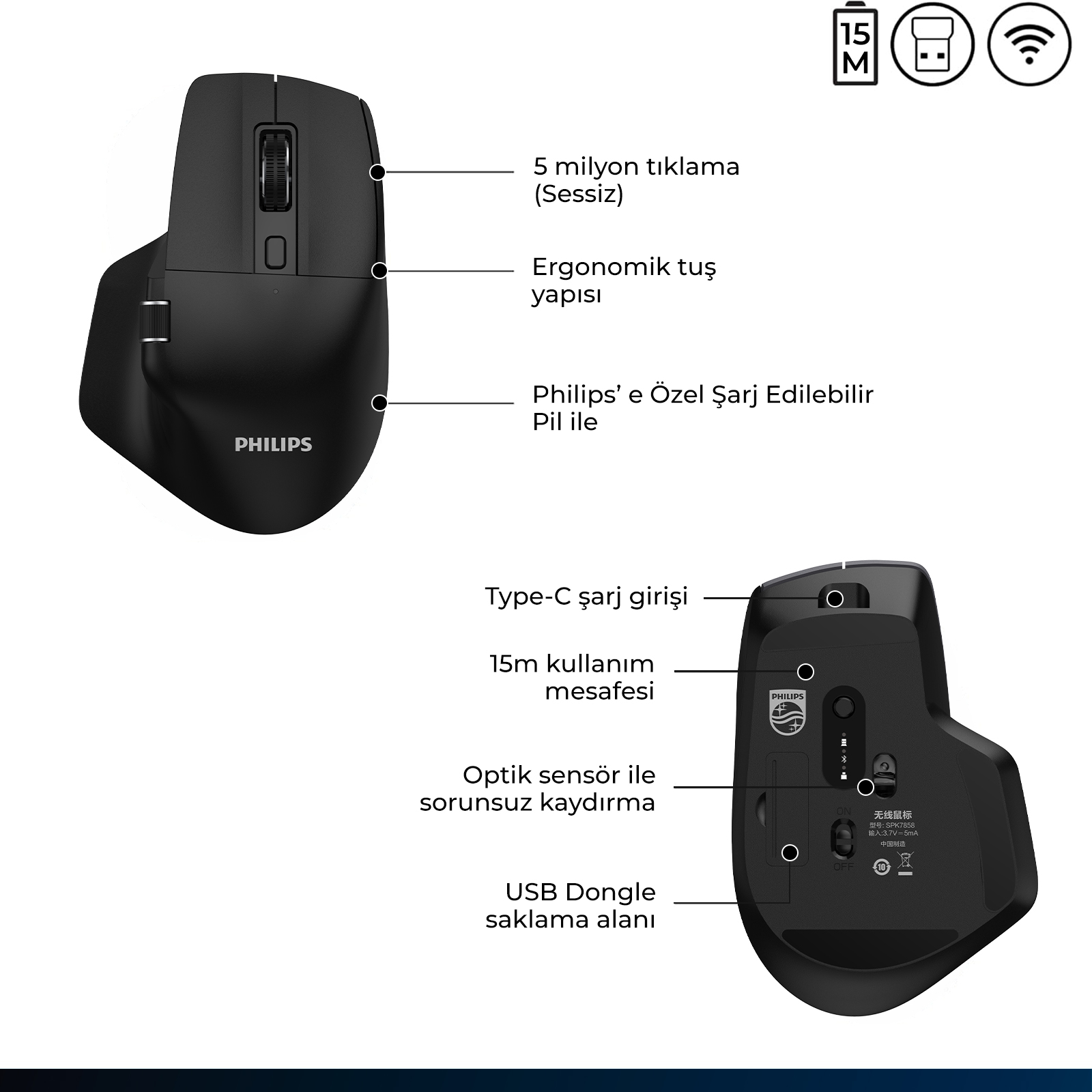 Philips SPK7858, 4000 DPI hassasiyetli optik sensörü, 7 sessiz tuşu, ergonomik tasarımı ve üç kanallı 2.4GHz/Bluetooth çift mod bağlantısıyla ofis, oyun ve mobil kullanımda uzun ömürlü, konforlu ve kesintisiz kablosuz kontrol sağlar.