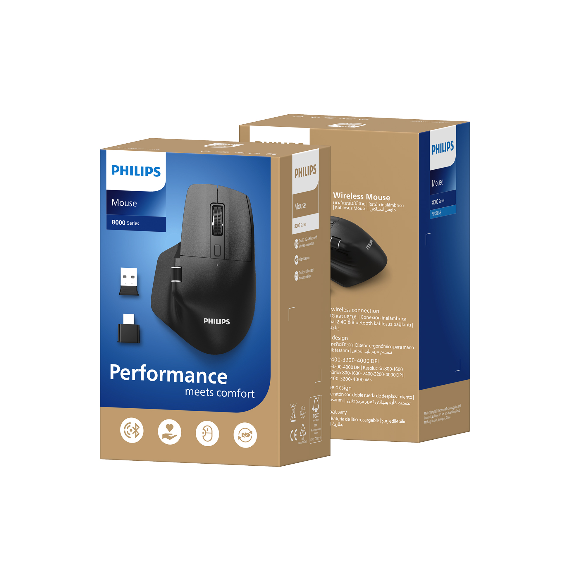 Philips SPK7858, USB-A ve USB-C çift dongle ile hem klasik hem yeni nesil cihazlarla tam uyum sağlar. Bluetooth desteği sayesinde aynı anda üç cihaza bağlanabilir ve tek tuşla hızlı geçiş yapabilirsiniz. Maksimum uyumluluk ve gerçek kablosuz özgürlük bir arada.