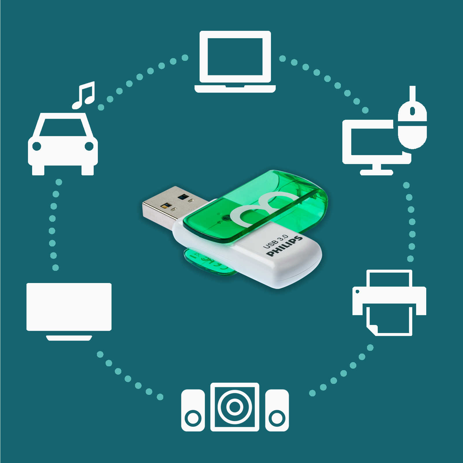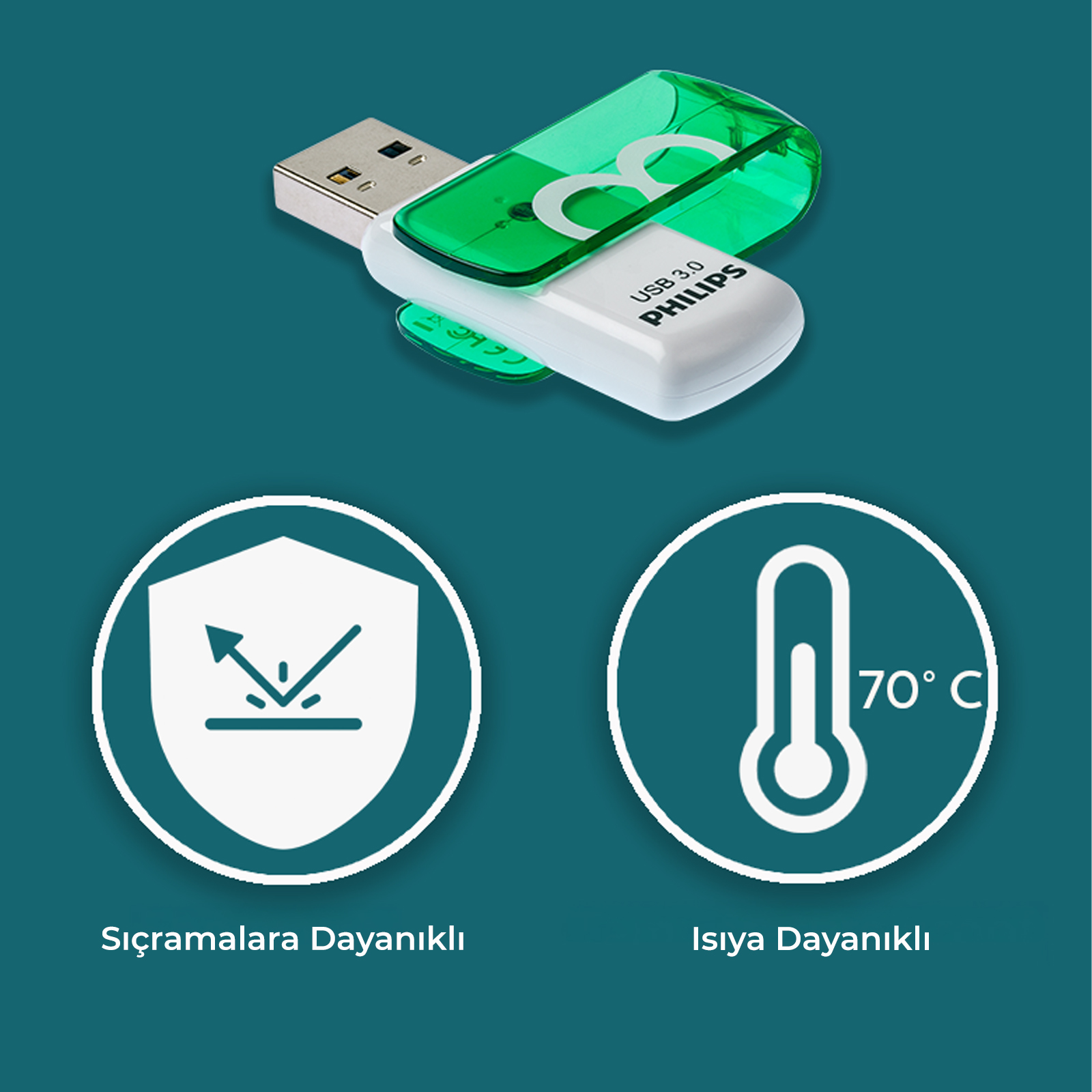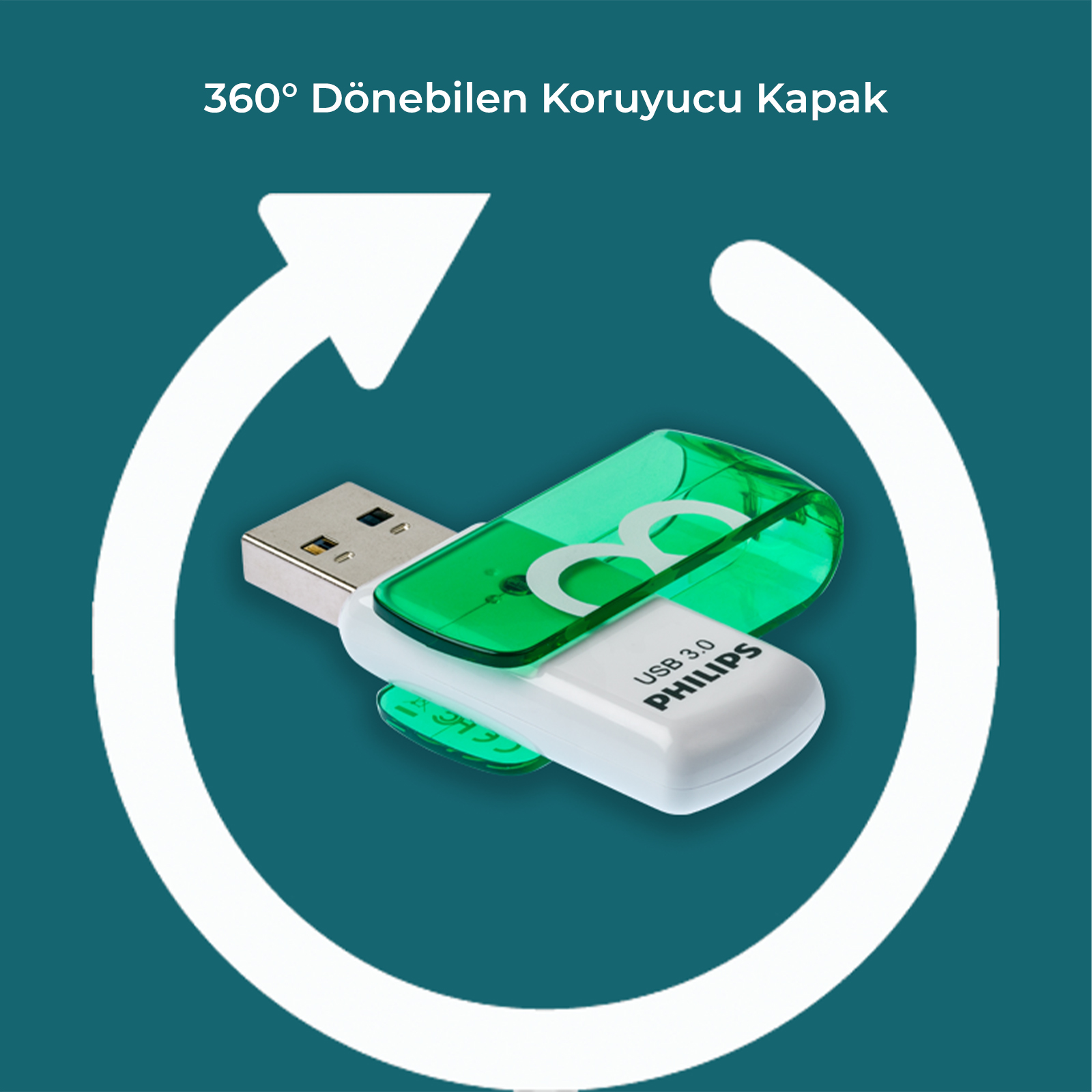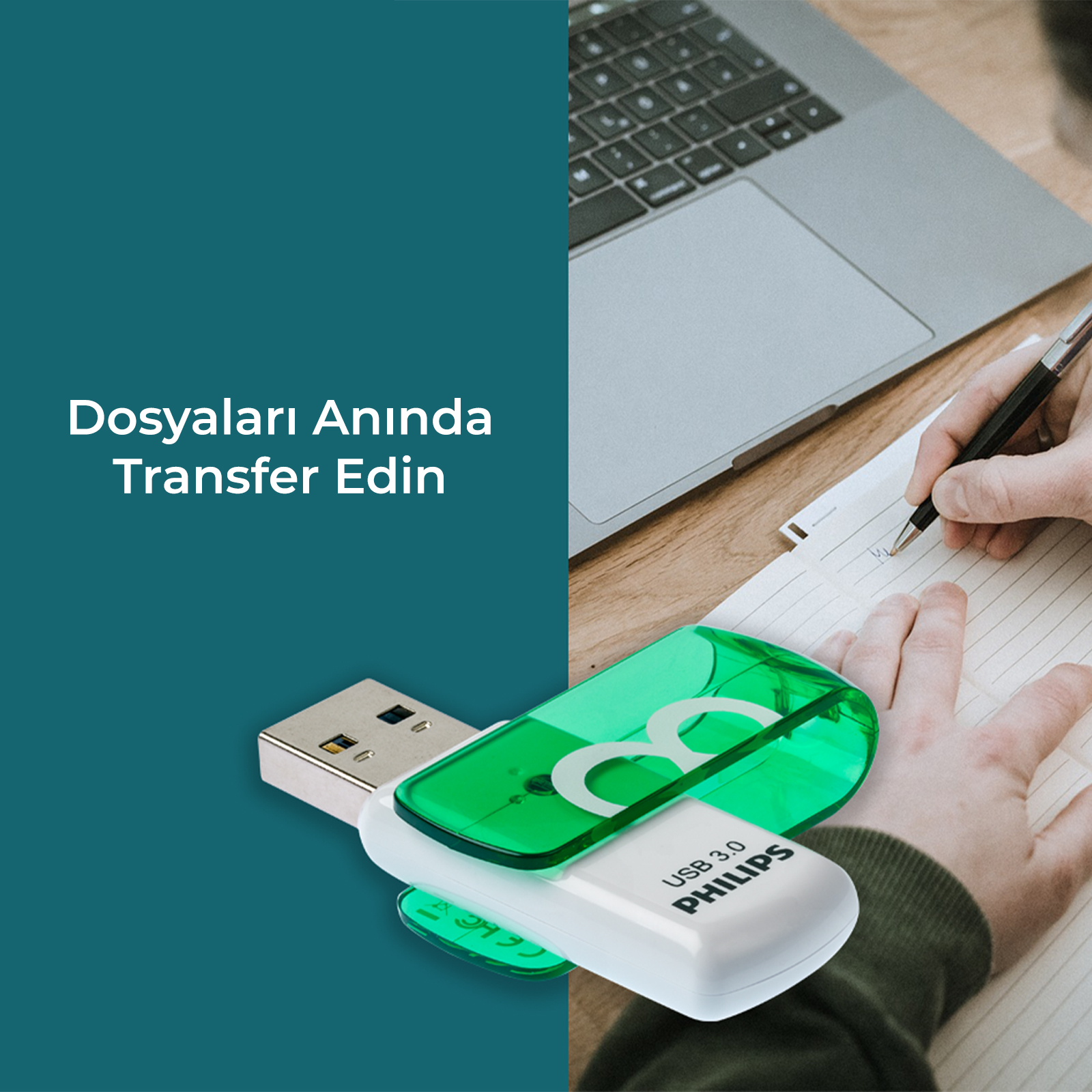 Philips Vivid 8 GB USB 3.0 Flash Bellek, ~100 MB/s’ye kadar okuma hızıyla USB 2.0’a göre çok daha hızlı veri aktarımı sunar; kompakt tasarımı, arkaya takılabilen koruyucu kapağı ve LED gösterge ışığıyla belgelerinizi, fotoğraflarınızı ve müziklerinizi güvenle her yere taşımanızı sağlar.